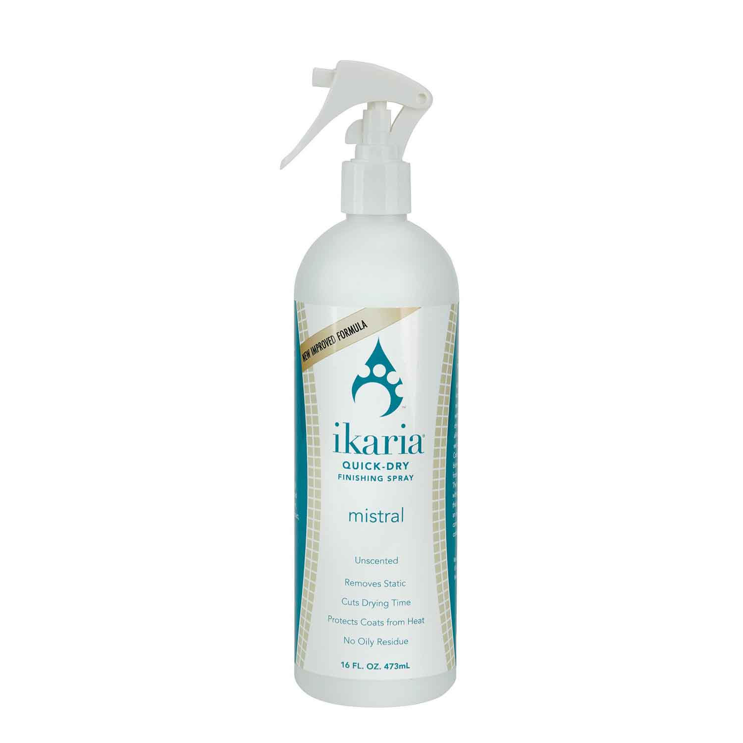 Ikaria Mistral Quick Dry Spray is a groomer's best kept secret! Speeds drying process protects hair and coats and leaves coats full and manageable without any oily residue. Unscented formula perfectly complements shampoo and conditioner scents. Made in the USA.