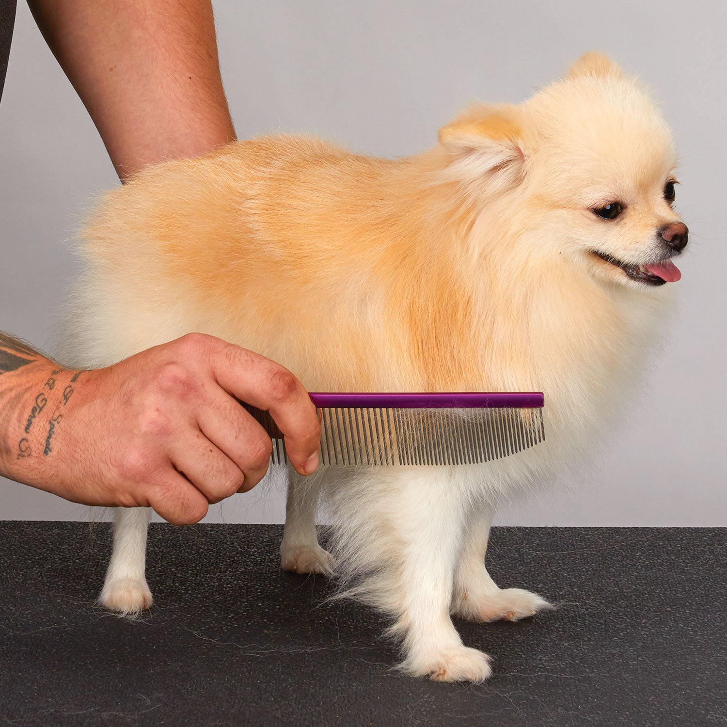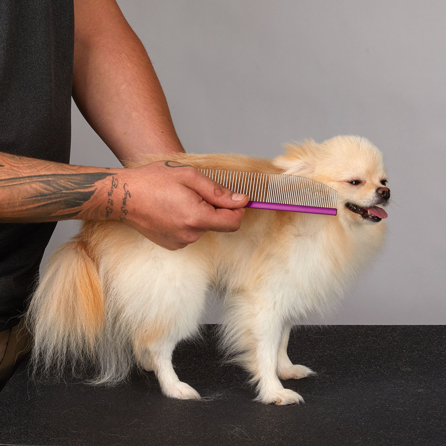 A versatile tool designed for finishing and fluffing hair also helps maintain the pet's coat health. Glides through coats helping to remove tangles and mats without causing discomfort. Angled end can help reach deeper into the coat to untangle areas that are more challenging to reach with a straight comb. Particularly effective for pets with double coats. The coarse teeth can penetrate the topcoat to remove loose undercoat fur which helps reduce shedding and prevents matting. The angled end makes it easier to groom around sensitive and hard-to-reach areas like the face ears and paws without causing discomfort to the pet. Light weight helps reduce hand fatigue.