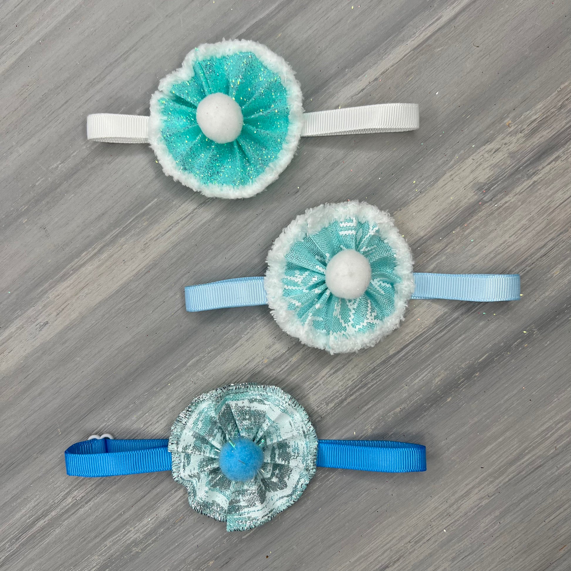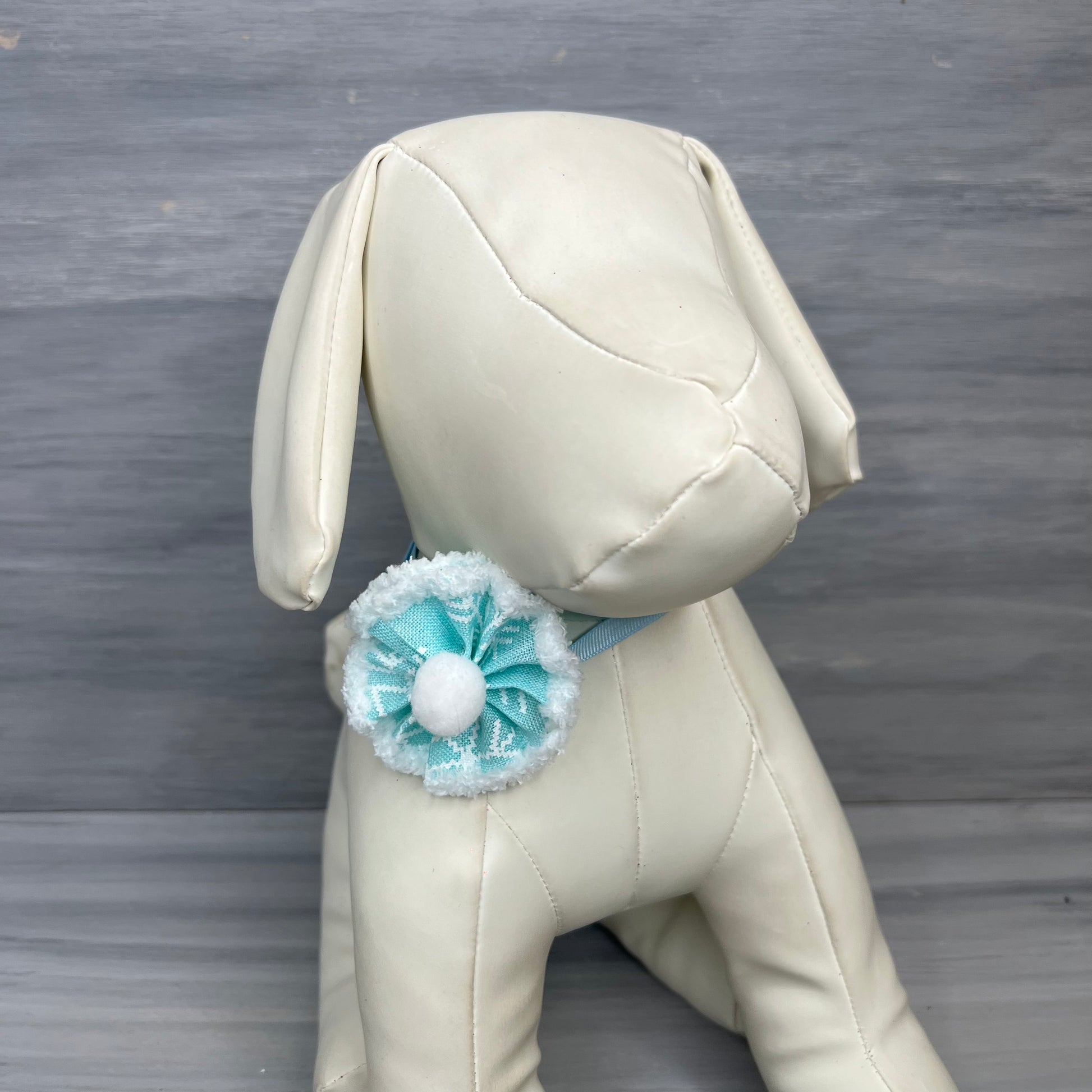 Our Ruffled Pom bows on an adjustable neck ribbon. Great for dogs with cute short haircuts.