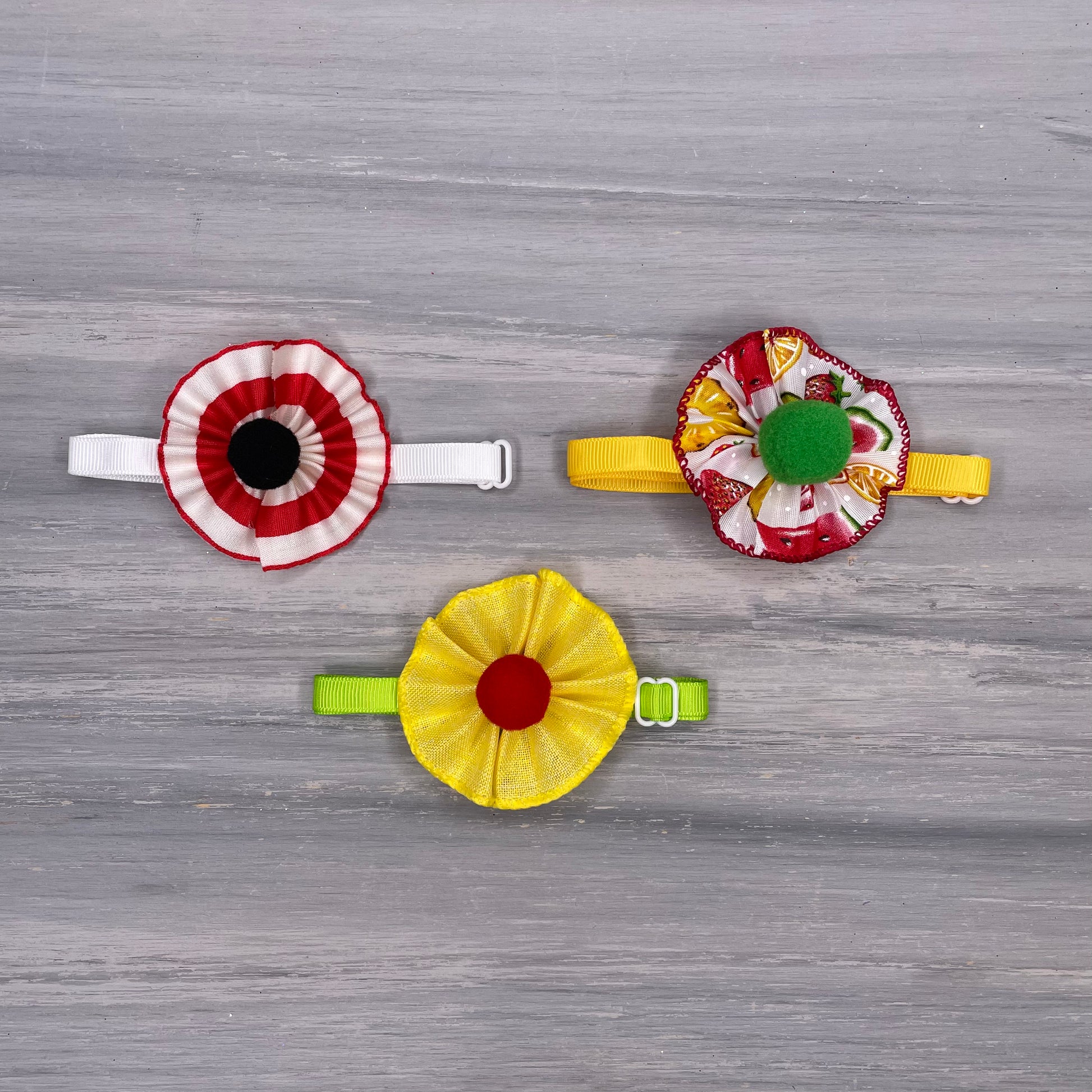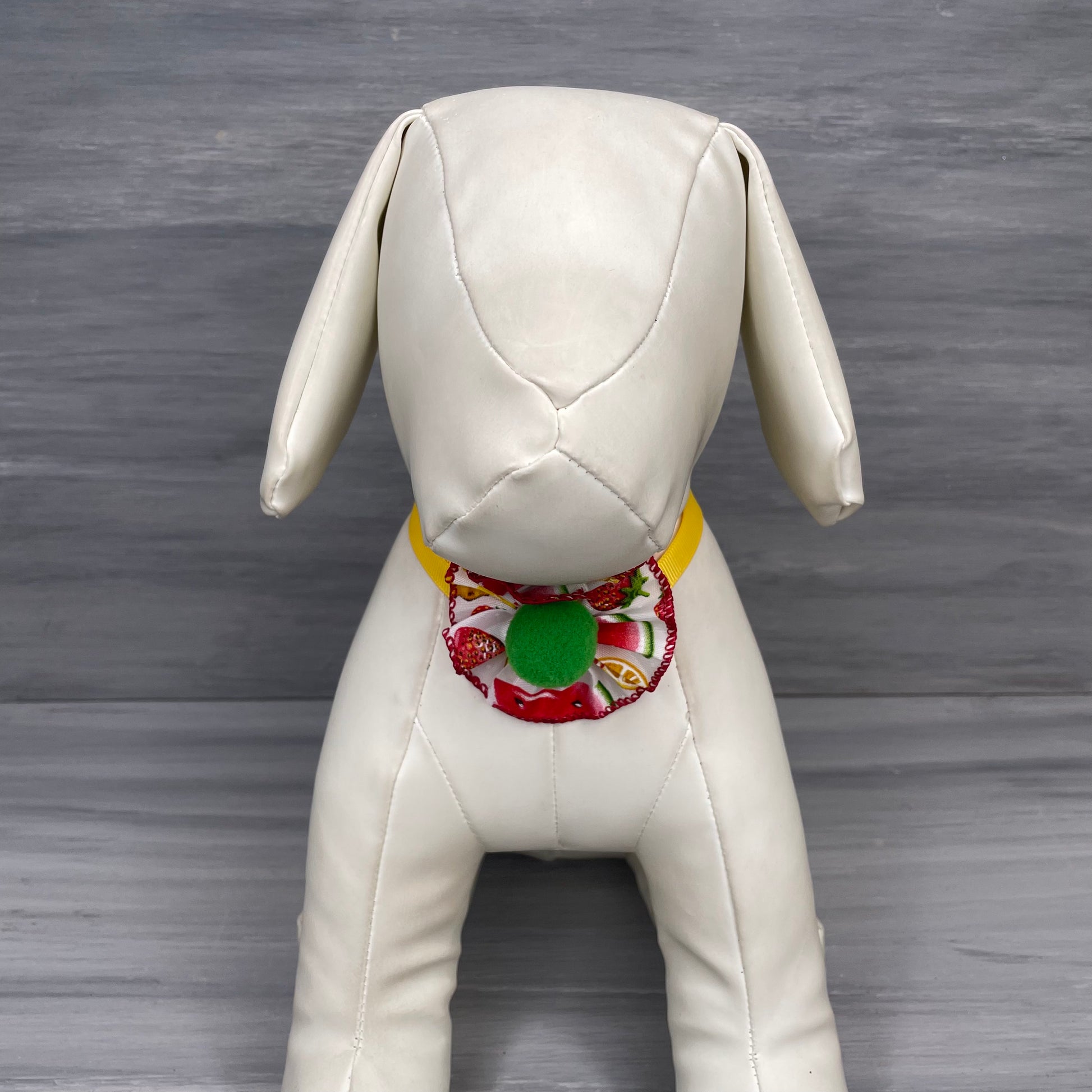 Our Ruffled Pom bows on an adjustable neck ribbon. Great for dogs with cute short haircuts.