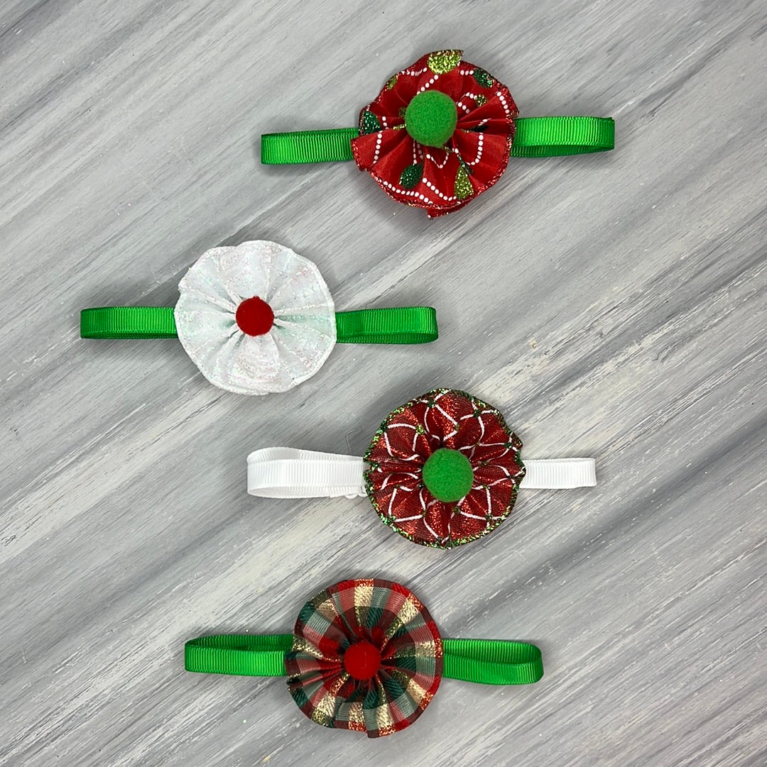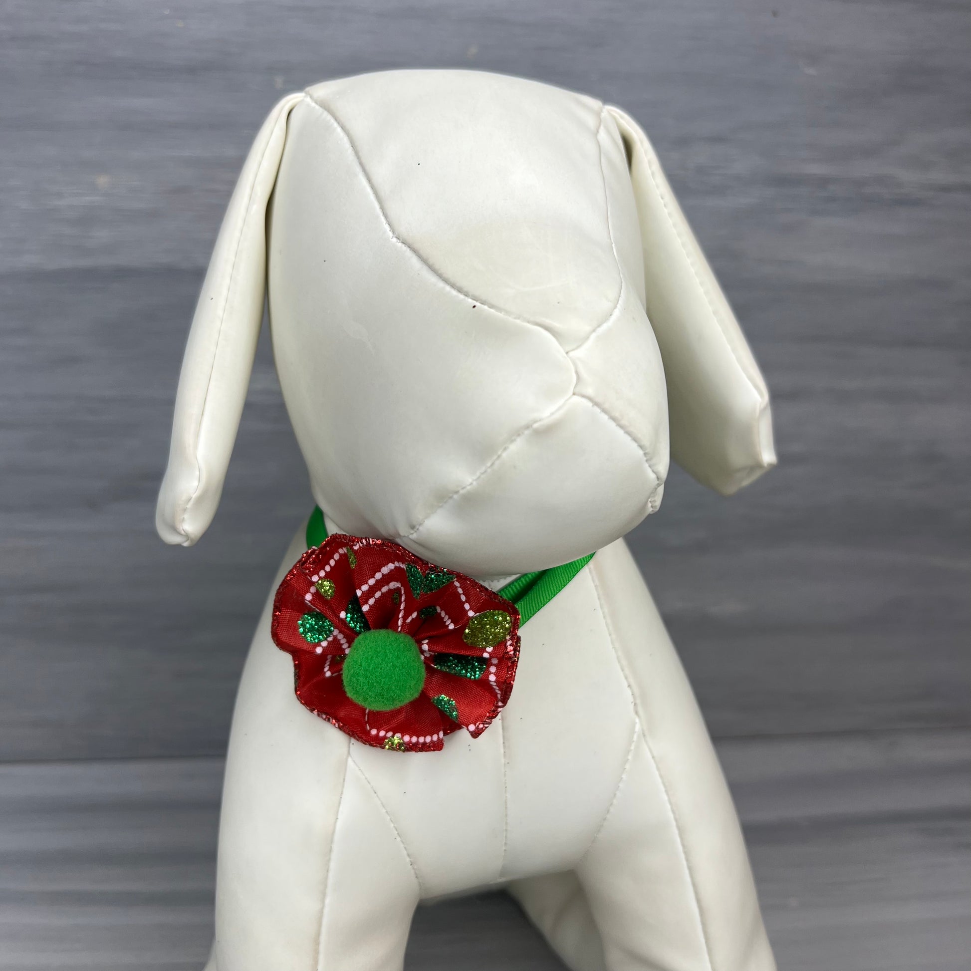Our Ruffled Pom bows on an adjustable neck ribbon. Great for dogs with cute short haircuts.