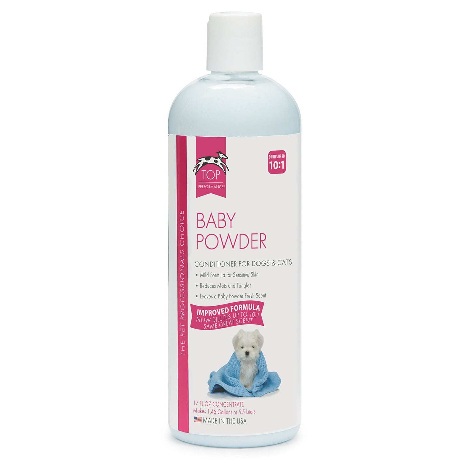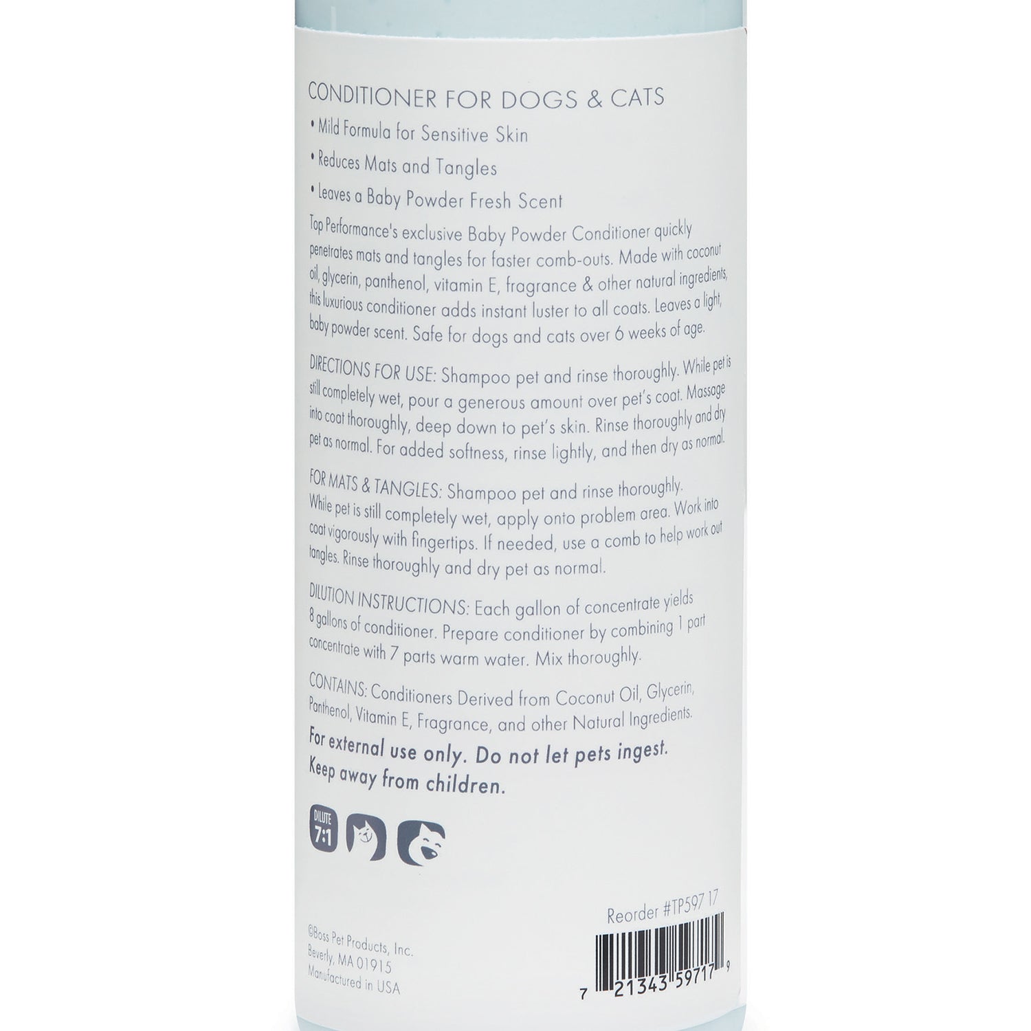 Gentle yet effective tearless formula crafted with a blend of nurturing ingredients is perfect for all coat types. Safe for regular use ideal for pets with sensitive skin. Mild Baby Powder fragrance leaves a refreshing fragrance.Silky soft Conditioner nourishes and hydrates coat leaving it soft and manageable. Gently smoothes and detangles without adding weight. Cosmetic grade acids help to detangle and smooth each strand reducing frizz while Aloe Vera Gel soothes and hydrates promoting a healthy scalp. Cosmetic grade vegetable glycerin moistures ensuring lasting softness. Dilutes 10:1. Made in the USA.