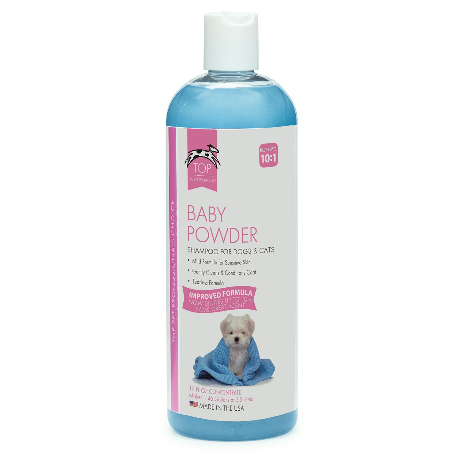 Our Top Performance® Baby Powder Shampoo and Conditioner leaves pets with a powder fresh scent. Rich-lathering gentle formula is ideal for sensitive skin. Gallon size and larger shampoo dilutes 16:1. Made in the USA.