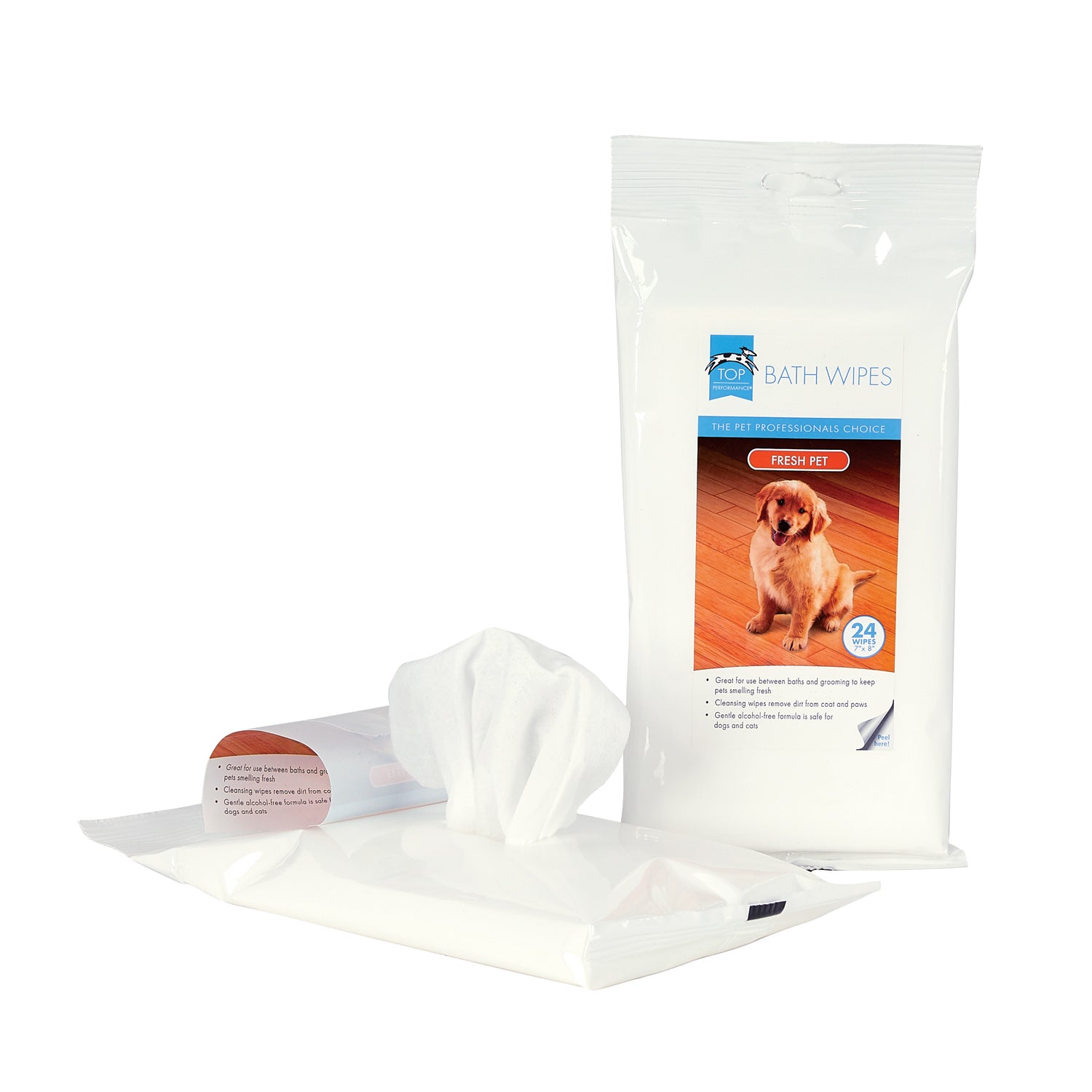 Top Performance Bath Wipes are perfect for keeping dogs and cats fresh and smelling great between baths. Cleans conditions and helps remove odor dirt and pet dander. Perfect for maintaining pets between grooms baths or playtimes. Wipes are alcohol free and are safe for cats and dogs. 24 pak 7'' x 8'' wipes.