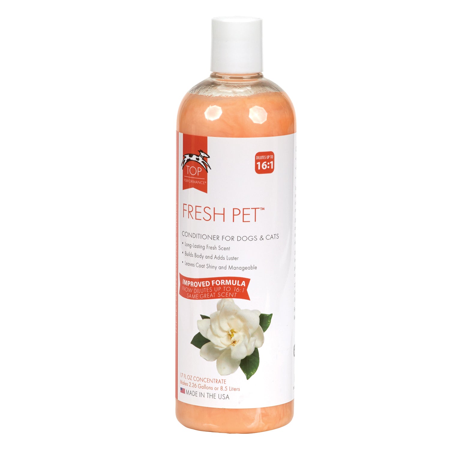 Improved Formulas! Same great scent! Now dilutes 16:1. Top Performance Fresh Pet Shampoos and Conditioners are the perfect pairing for the professional groomer! Infused with nourishing Aloe Vera Gel and Cosmetic grade vegetable glycerin this formula hydrates and soothes the skin while conditioning fur making it easier to comb through and manage. The Fresh Pet Fragrance provides a pleasant long-lasting scent. Perfect for regular grooming this conditioner is formulated with mild ingredients to keep dog's coat shiny and smooth. Best Seller! Made in the USA.